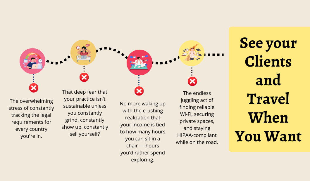 Apply the step-by-step Portable Practice Method to align your private practice with your travel goals.